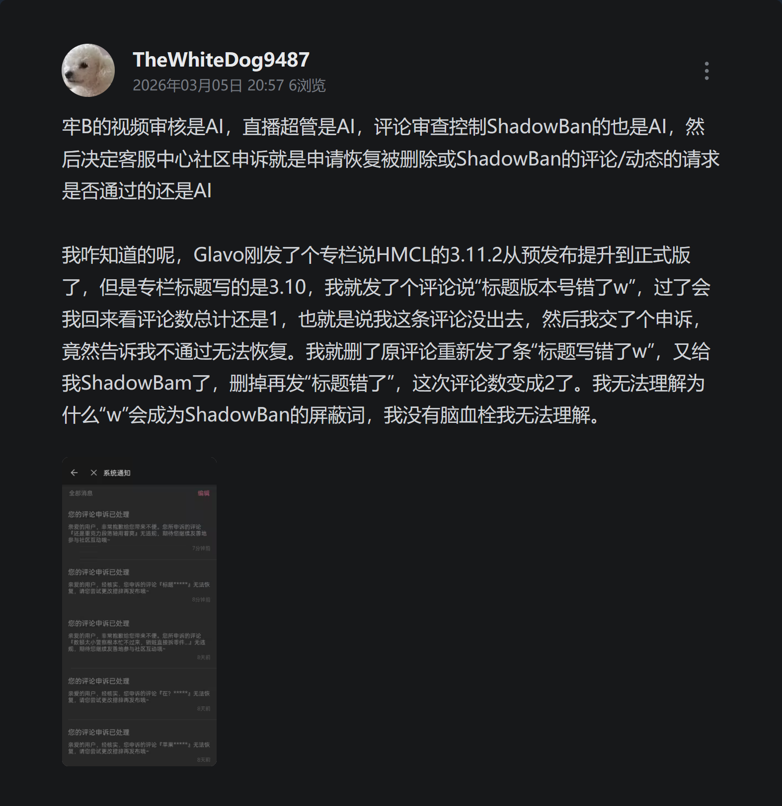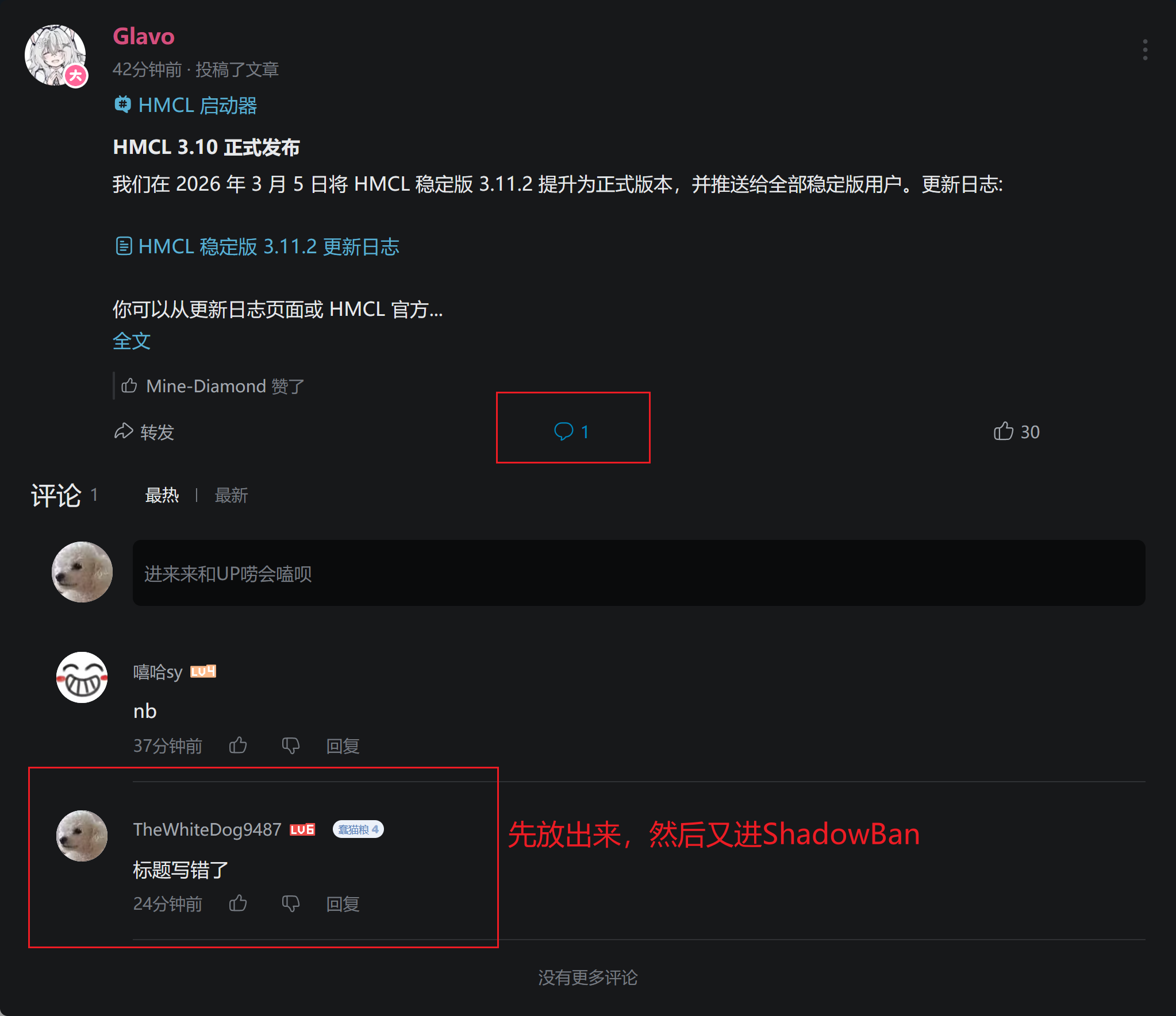 我咋知道的呢,Glavo刚发了个专栏说HMCL的3.11.2从预发布提升到正式版了,但是专栏标题写的是3.10,我就发了个评论说“标题版本号错了w”,过了会我回来看评论数总计还是1,也就是说我这条评论没出去,然后我交了个申诉,竟然告诉我不通过无法恢复。我就删了原评论重新发了条“标题写错了w”,又给我ShadowBam了,删掉再发“标题错了”,这次评论数变成2了。我无法理解为什么“w”会成为ShadowBan的屏蔽词,我没有脑血栓我无法理解。