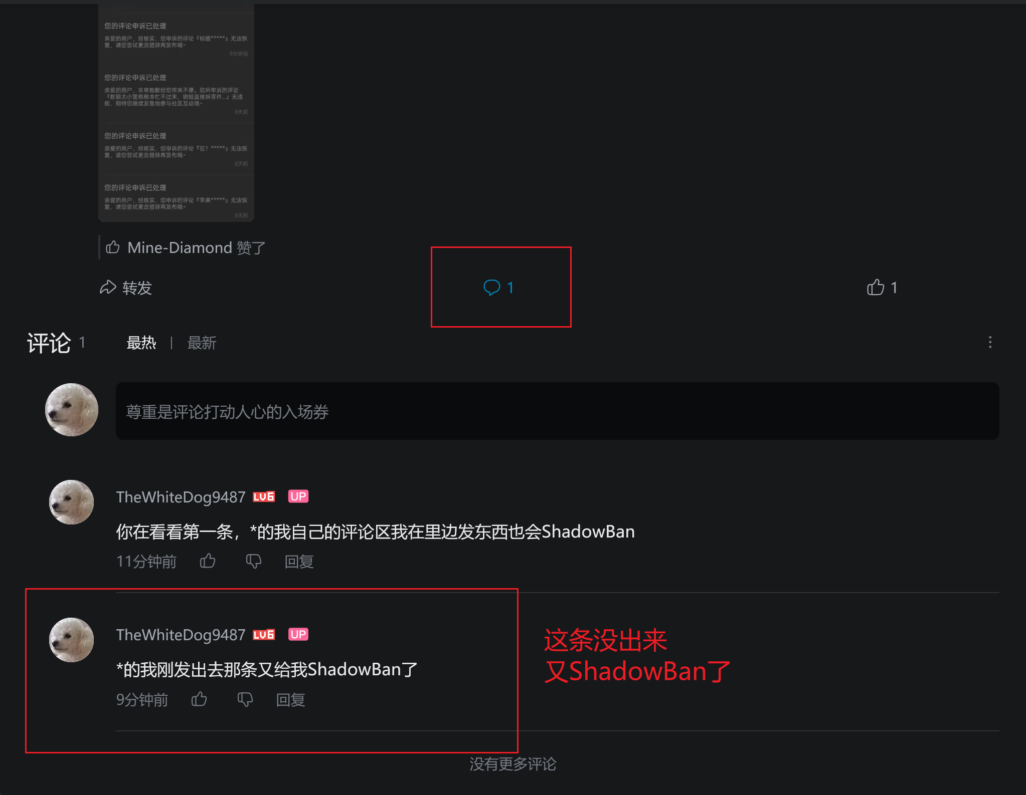 - 如果是动态下的评论区,可以观察打开评论区按钮旁边的总评论数,比如这篇文的第二张图,总共一个评论但是展开有两条,那至少就有一条进了审核或者ShadowBan。